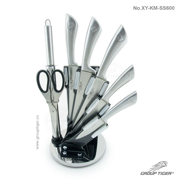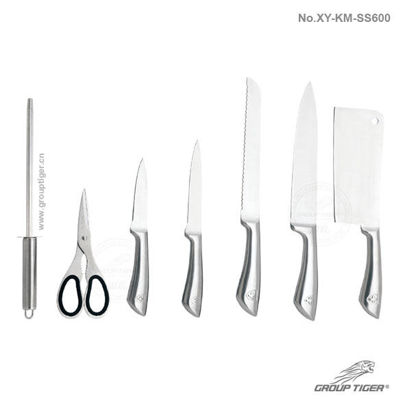 Material: S/S 3CR13+Steel Handle. Size: 6.5" Cleaver, 8 " Chef knife, 8 " Bread knife, 5 " Utility knife, 3.5 " Paring knife, 7.25" Scissors, 7.5" Sharpener.